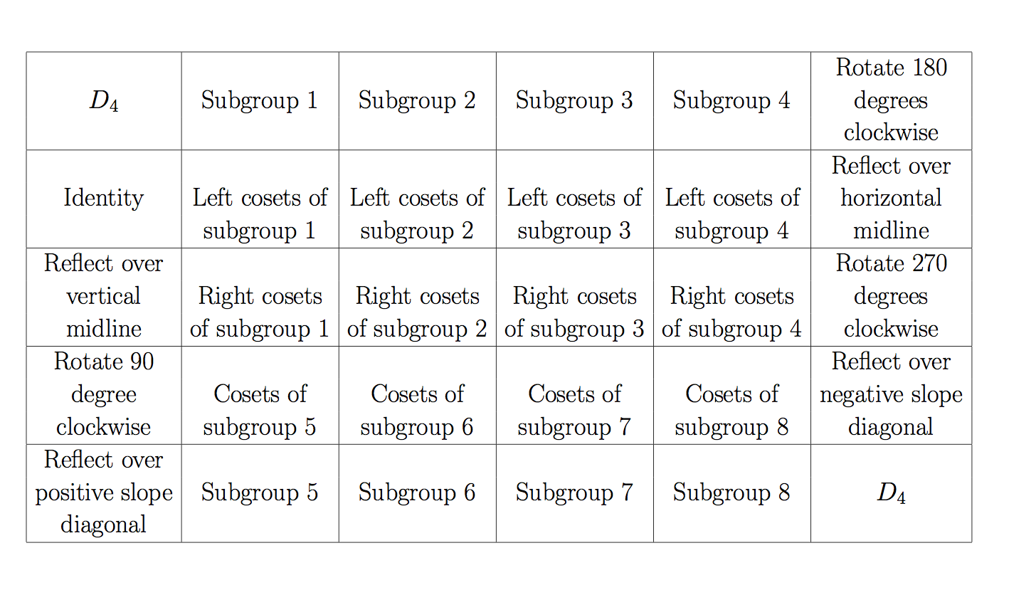 The group D4 can be thought of as the symmetry transformations of a square. The diagram below encodes the word description that follows. The full group is represented by the full flower motifs in the upper left and lower right corners. Each of the eight elements of D4, represented by one of the flowers with a single filled petal, appears along the left or right edge of the table; the identity element is the first single petal flower in the second row. Each single petal flower represents the symmetry transformation of D4 that takes the petal representing the identity element to that specific petal. Thus, the single petal flower at the left end of the third row represents the symmetry transformation reflect over the vertical midline, and the single petal flower below that represents the symmetry transformation rotate 90 degrees clockwise. Across the top and bottom rows, excluding the left and right ends, appear the non-trivial subgroups of D4. The second and third row consist of multicolored flowers representing the left (top row) and right (middle row) cosets of the subgroups on the top-most row. Each color in each flower is a coset. The bottom row of multicolored flowers represents the cosets of the subgroups on the bottom-most row. The bottom row of subgroups are normal, so their left and right cosets are the same. Please see the accompanying schematic.