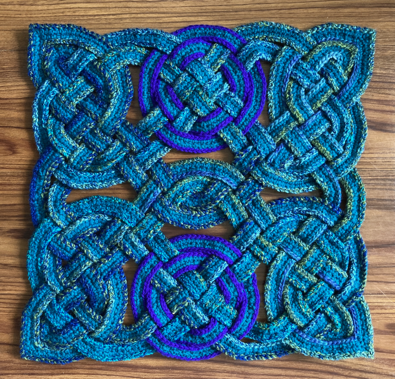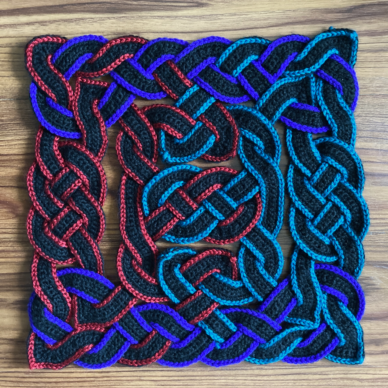 Established and straightforward techniques exist to crochet a small number of geometric shapes, including straight lines, right angles, and semicircular arcs. Each knot component was approximated with combinations of these shapes. The two pieces displayed here were drafted by the designer with the folkloric algorithm, then interpreted as combinations of crochetable shapes, and crocheted accordingly, to test the viability of the general method.