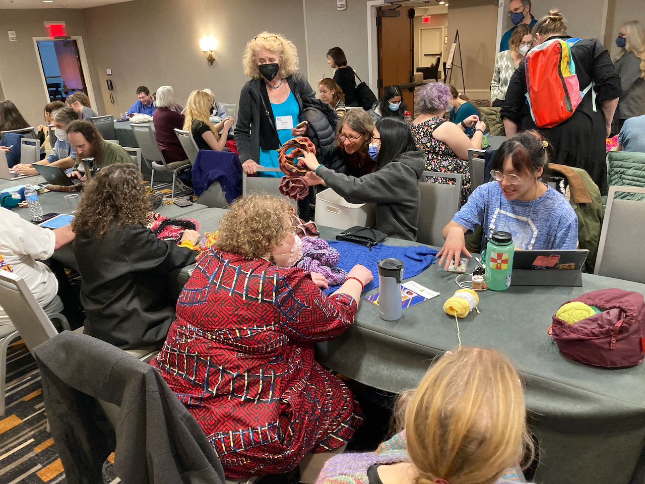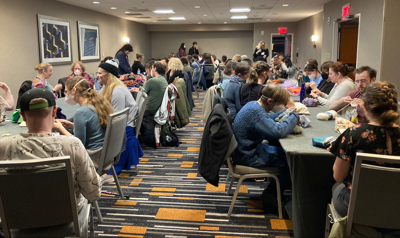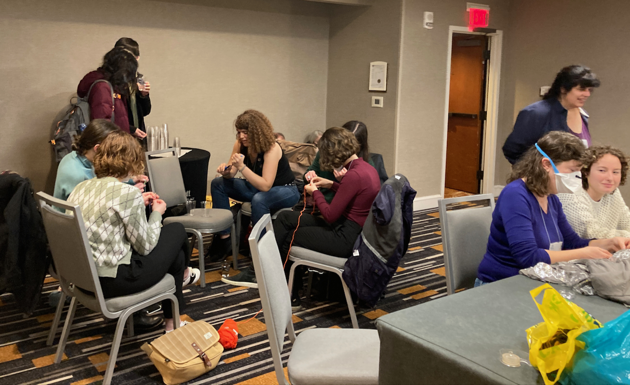 Shortly after, more people arrived than there were chairs in the room. We quickly stole a dozen chairs from a nearby empty room. There were at least 65 attendees (at least that's how many appeared on our sign-in sheet)! In addition to JMM participants, local Ravelers and local high-school students (from a class involving math and fiber arts!) joined us.
