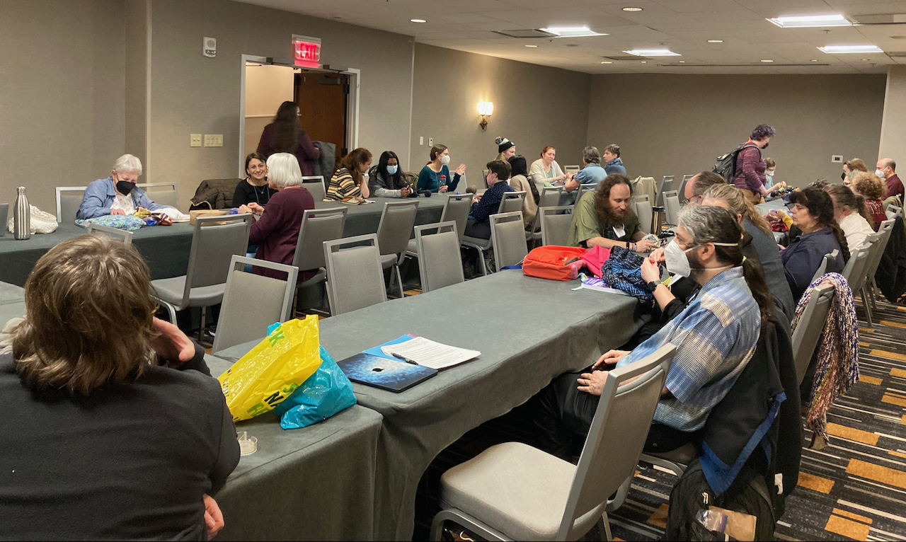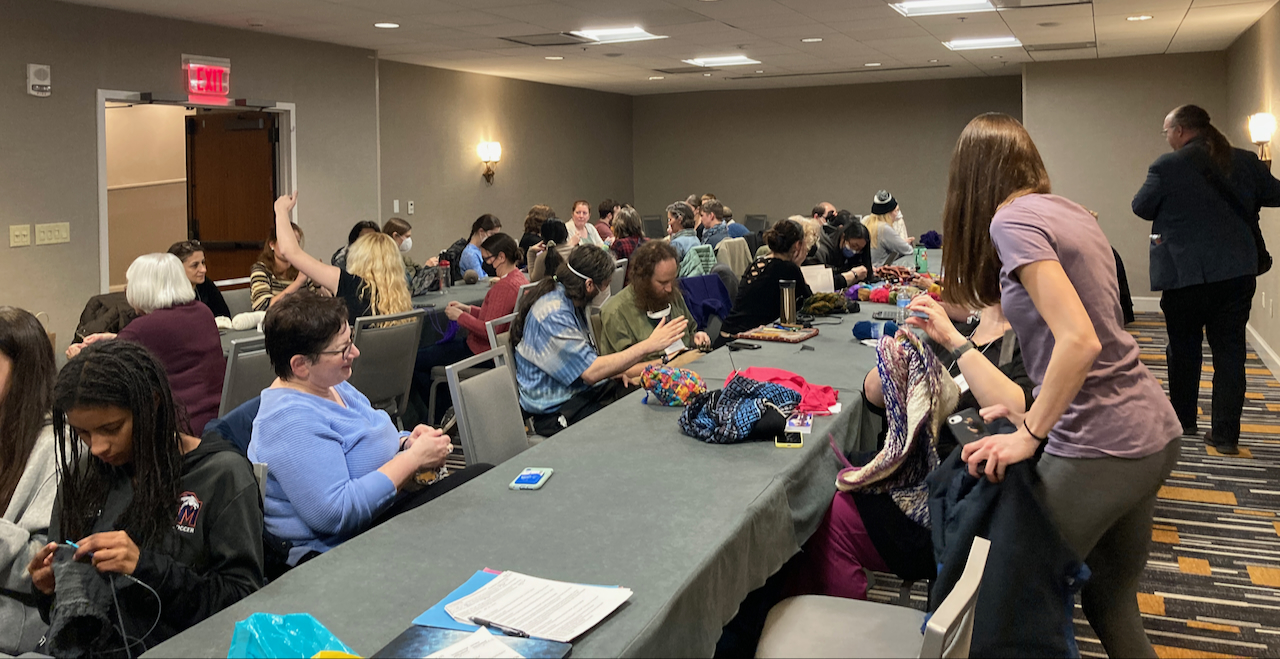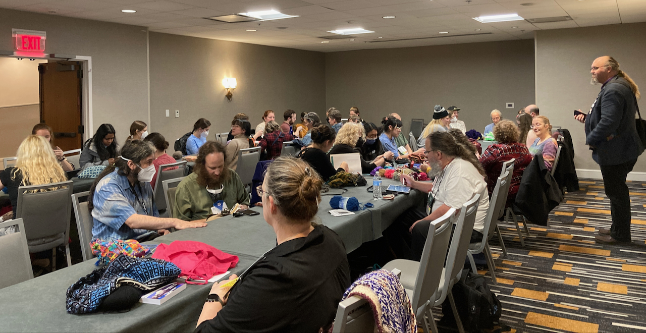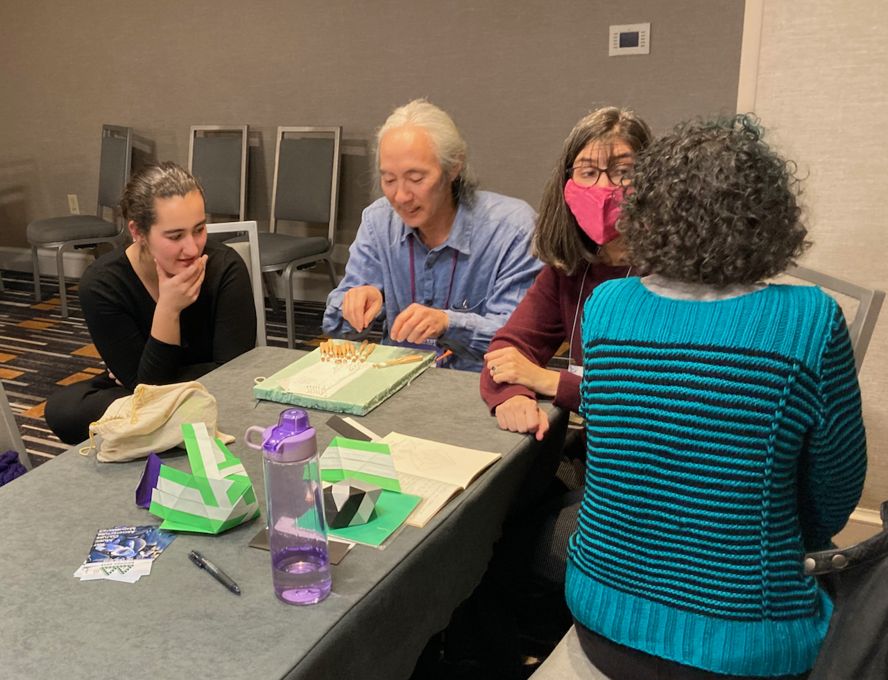 Shortly after, more people arrived than there were chairs in the room. We quickly stole a dozen chairs from a nearby empty room. There were at least 65 attendees (at least that's how many appeared on our sign-in sheet)! In addition to JMM participants, local Ravelers and local high-school students (from a class involving math and fiber arts!) joined us.