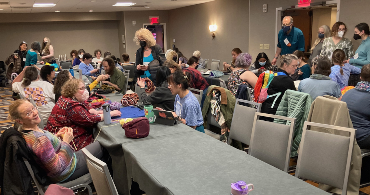 Above right, Sara Jensen confers with Melinda Koelling (who is behind Sara in this photo) about sequence knitting.