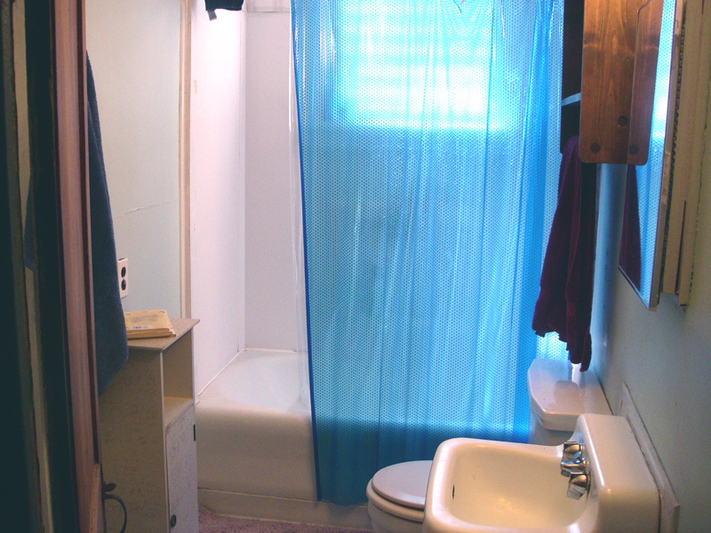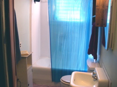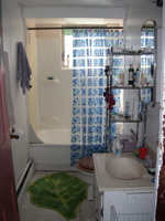 ![]() first-floor bathroom (larger picture) Recently we found a small green-with- grey-feet toad in the bathtub. |